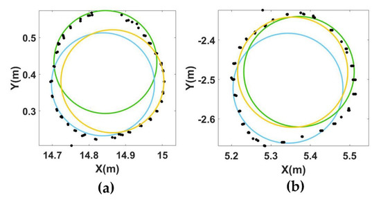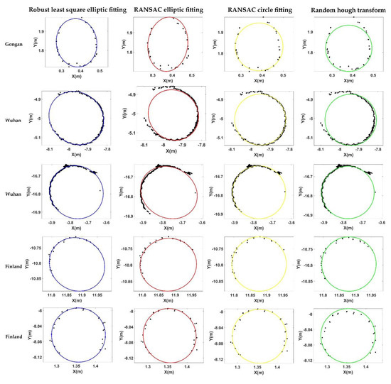 From Table 5, we can see that the robust least squares ellipse fitting performs the best out of the four algorithms. The mean RMSE of the proposed estimation method is 1.14 cm, compared with the other methods’ mean RMSE values of 1.70, 2.03, and 2.14 cm. The mean relative accuracy of the proposed estimation method is 95.2%; compared with other methods, the mean relative accuracy is 92.9%, 91.9%, and 90.9%. Stem profiles are elliptical, and as the DBH increases, this elliptical shape becomes more pronounced. The average DBH of the trees in plots Wuhan and the Gongan are both greater than 26 cm and the relative RMSE and relative accuracy of the robust least square ellipse fitting algorithm in these two plots is higher than that in Finland. This proves that the elliptical model can describe the stem profiles better. The result is also verified in Figure 8, which shows the fitted results of three plots. Obvious ellipse characteristics are seen from the experimental stem profiles of Wuhan and Public Security. The average DBH of the Finnish plot is less than 17 cm. Furthermore, each index in Table 5 shows that robust least squares ellipse fitting is the best fitting method among them. It should be mentioned that, due to the voting mechanism of the random Hough transform, the detected circle results have a certain false positive rate. For example, the best fitting circles of two trees in plot Gongan are not unique while using the RHT method, and the fitted circle is significantly smaller, which is shown in Figure 9.