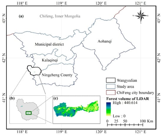 The study area, covering four administrative regions, located in Chifeng, Inner Mongolia (a, b, and c denote the study area, Wangyedian forest district in which the LiDAR scanning result located, and partial enlargement of LiDAR data respectively).