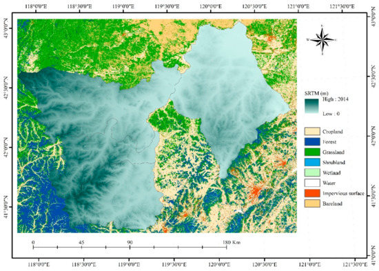 The Shuttle Radar Topography Mission (SRTM) (http://srtm.csi.cgiar.org/srtmdata/) was a National Aeronautics and Space Administration (NASA) mission undertaken in 2000 to enable accessing elevation data from 56°S to 60°N (over 119 million km2, covering more than 80% of the global surface), which produced high-precision (one arc-second, or around 30 m) digital surface elevation models (DSM) from 9.8 terabytes C-band radar images that were obtained by the Endeavour Space Shuttle from 11–22 February while using radar mapping technology [56]. It has been providing a reliable source of data for geoscience analysis at global and regional scales as one of the world’s most complete high-precision terrain data [57,58,59]. The restricted administrative divisions using ArcGIS software were utilized to clip topographic data. The western elevation of the entire study area is higher than that of the eastern regions, and the highest elevation value from the SRTM of the study area is about 2000 m (Figure 2).