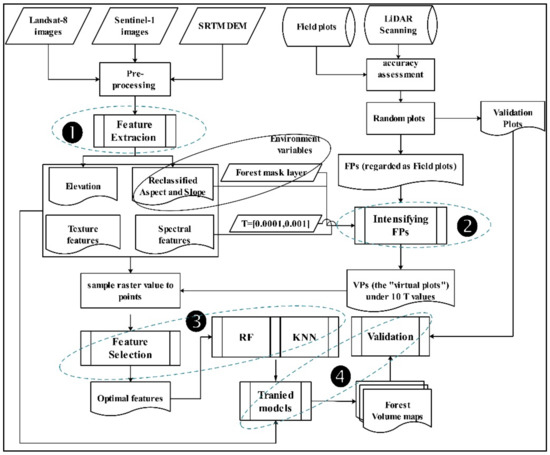 The overall workflow consists of the following four processes: (1) Extracting features from Landsat-8 and Sentinel-1; (2) intensifying points of forest volume that were derived from LiDAR mapping to generate training and validation samples; (3) feature selection and model training for RF and KNN algorithm; and, (4) estimating forest volume and assessing the accuracy of outcomes. Figure 3 shows the specific technical process.