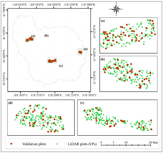 The forest volume has been extracted from LiDAR data in the Wangyedian forest district to produce training and validation. We firstly made an accuracy assessment of the original LiDAR scanning results while using the 17 field plots. We used the toolbox (create random point integrated in ArcGIS) to yield 666 forest reference plots from the 30m-resolution forest volume using LiDAR, of which 134 plots served as validation samples to assess the results for the further analysis, and 532 plots functioned as field plots (FPs refer to plots that were obtained by sampling LiDAR images and functioned as real field plots) used for subsequent virtual plots (VPs refer to the intensified plots using FPs) generation (Figure 4).