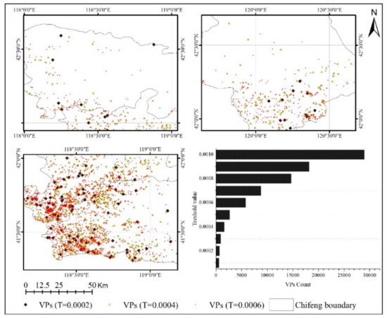 where e and r represent the environment and remotely sensed variables respectively, and the subscripts i and j indicate their corresponding index numbers. T denotes the threshold value that is used to quantify the spectral closeness; to find the optimal T value, we initialized the threshold in an interval [0.0001, 0.001], yielding a total of 10 threshold values. The threshold range was given in consideration of the one-sidedness and subjectivity of a single threshold, and it was inspired by previous related studies on measurement of spectral closeness of Landsat-5, where a fixed threshold (0.01) was given [47]. As we all know that if the threshold is too lenient, the VPs would be very error-prone. Therefore, we took 0.01 as the maximum threshold and try to find a better threshold.