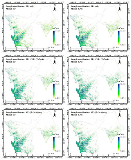 The forest volume mappings were produced while using the two trained models, and the results were evaluated using the validation samples (Figure 4). All of the selected sample combinations were separately entered into RF and KNN model to carry out the estimation process. According to accuracy validation, the variation of the R squared value is shown in Figure 6. All of the variations show an increase after decreasing rapidly, and the highest precisions were obtained at the peak point of T = 2 × 10−4, where the R squared values were found to be more than 0.6, higher than using only FPs combination (two horizontal lines). In addition, the accuracy of the same model, taking the RF model as an example, was found to be consistent under the driving of the two sample combinations, (i.e., FVP and VP), and additionally adding the original sample (FVP, red curve) shows a better performance, and its accuracy was found to be higher than that of only using the extended sample (VP, yellow curve). When compared with the KNN model, this difference in the accuracy of different sample composites that were generated by the random forest model was smaller, indicating that the random forest model was more stable and robust to forest volume estimation (Figure 7). The root mean square error (RMSE) and mean absolute error (MAE) variations agree with the R squared value.