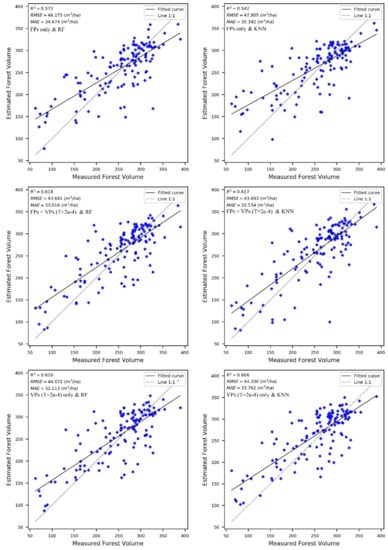 We have considered the RF and KNN models to estimate the highest precision results of forest volume distribution containing three groups, of which each was made up of two mappings from the corresponding models (Figure 8), and we also conducted an accuracy assessment while using the validation samples (Figure 9). The results show that the forest volume across the study area varies from 50 to 360 m3/ha, and spatial distribution shows the difference between original samples (FPs only) and additionally adopting expanded samples (i.e., ) only and FPs + ). For the former, the high values were mainly concentrated in the west of the Kalaqinqi and Ningcheng county, while they were also distributed in the south of Aohanqi with the adding of VPs. The scatter plot shows that expanding the FPs collection can potentially improve the accuracy of the outcome when compared to the use of only FPs. The RF model using the VPs only combination performed a better precision result than that driven by only FPs; the result was further improved (R2 = 0.618, RMSE = 43.641 m3/ha, and MAE = 33.016 m3/ha) by combining of FPs with VPs (i.e., FPs + VPs) while using the RF model. The accuracy trend using the KNN model was similar to the RF, and the accuracy of the outcomes of the two models was almost the same for the same sample combination, reaching the highest accuracy (R2 = 0.617, RMSE = 43.693 m3/ha, and MAE = 32.534 m3/ha). The accuracy for the forest volume distribution was almost same (R2 = 0.62, RMSE = 43 m3/ha, and MAE = 32 m3/ha) with the comparison of two models.