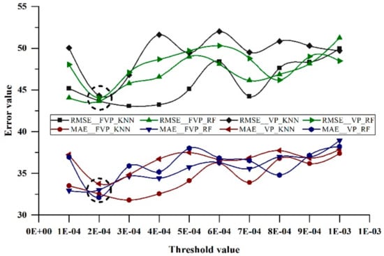 The model training step of RF and KNN was carried out based on the previously selected 10 features, and the grid-searching implements determined all of the optimal values for hyper-parameters of models under 10 different threshold conditions (i.e., from 1 × 10−4 to 1 × 10−3 in 1 × 10−4 step length). The resulting optimal models were used in the volume estimation.