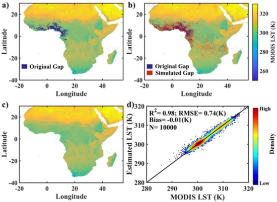 The R2, RMSE, and bias of original LST and estimated LST on three continents are presented in Figure 3d, Figure 4d, and Figure 5d. In general, the R2 values in all three continents are greater than 0.9, and even reaching 0.98 in Africa. The bias values are all close to 0.01K and RMSE values less than 1K. Furthermore, according to the point density shown in Figure 3d, Figure 4d, and Figure 5d, most of LST values are concentrated on 1:1 line (the straight line y = x in the plane ), which indicates that the estimated LST has a close agreement with original LST on all three continents, and DCT-PLS method provides a stable, robust filling result. In addition, this stable filling process smooths all the values and performs quite well also on extreme values. The variability range of original LST in South America (260 K–320 K) is greater with respect to Africa and Southeast Asia (280 K–320 K), and exist more extreme values located around low LSTs and high LTSs (Figure 3d and Figure 4d). Yet the estimated LSTs still closely follow the 1:1 linear trend and concentrated around 300 K (Figure 5d), which confirms the robust smoothing effect of DCT-PLS method. However, it is worth noting that because of the limitation to obtain a large conterminous spatial information for filling data gaps in Southeast Asia with fragmental islands, the validation results in this region have a relatively smaller R2 (0.92) and a relatively larger RMSE (1K), which is consistent with the fact that DCT-PLS method relies on high frequency information of datasets for reconstruction. Based on high-frequency information of original LST, the DCT-PLS method smooths the extreme values and present a stable, robust smoothing on whole datasets, which helps to retain the global spatial patterns. Yet the filling process on a single LST pixel is easily affected by the global trend when DCT-PLS is used in areas with a wide range of LST values. Indeed, in the presence of outliers, some robust penalization procedure must be taken into accounts as suggested by Garcia [46]. Due to the slow variation of emissivity in regions with a homogeneous orography, LST is a relatively stable parameter in the physics of land surface processes. Thus, the substantial data gaps can be well filled by the DCT-PLS method with sufficient and available spatial information.