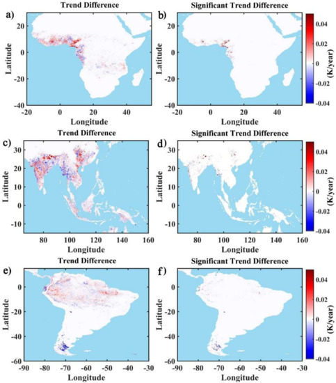 Trend differences between the original LST and estimated LST: (a, c, e) trend differences of LST in Africa, Southeast Asia, and South America, respectively; (b, d, f) significance of trend differences in Africa, Southeast Asia, and South America, respectively.