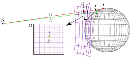 Parallax shift problem. The violet surface represents an image obtained from a geostationary satellite. The cloud top (T) is observed by the satellite as T’ (on the violet surface). The result of the reprojection of point T’ to ellipsoidal coordinates is I, which is not true the location of the cloud. The true location of the cloud is denoted as B, and from the perspective of the satellite sensor is observed as B’ on the violet surface. The square (marked as 1) shows how parallax shift affects the satellite image, where T’ is an image of the cloud top and B’ is where the cloud top should be placed according to its geodetic coordinates. The scale of the cloud height is not preserved.