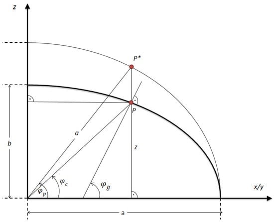 Three types of latitude: where is the geodetic latitude, is the geocentric latitude, is the parametric latitude, P is the point of interest on the ellipsoid, and P* is the image of the point of interest on a sphere. Based on figures from [,].