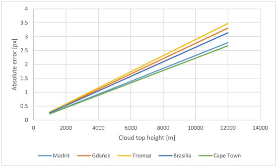 Regarding the scope of practical applications of the proposed approaches, it is important to note that the resolution of currently operating geostationary satellites varies between 1–3 km for a SEVIRI instrument [] and 1–8 km for a Geostationary Operational Environmental Satellite (GOES) imager []. The upcoming series of Meteosat Third Generation (MTG) satellites will provide imagery with a spatial resolution between 0.5 and 2 km []. All of the above-presented parallax methods are effective enough for current and near future geostationary observation satellites, and the usefulness of the proposed methods is negligible. Selection of the proposed parallax effect correction method will be significant only when the spatial resolution of geostationary observations is comparable to 50 m. With high data resolution and precise parallax effect correction, the algorithm influence of precision on cloud height will become noticeable.