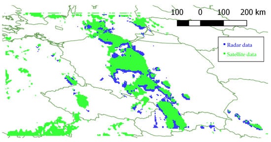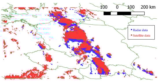 As mentioned earlier, this effect hinders the comparison process between satellite and ground-based radar data []. An example is depicted in Figure 4.