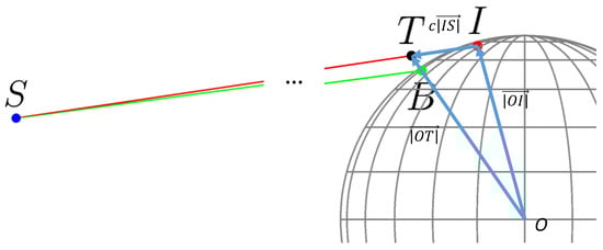 - Designate coefficient , which allows Cartesian coordinates of the cloud top to be calculated using the following equations (see Figure 5):where is described by the ellipsoid parametric equation:where and are the parametric latitude and longitude (see Figure 2). Therefore, Equation (9) can be presented as a set of equations:Squaring each equation and adding them according to their sides leads to a square equation, which can be solved with respect to c: