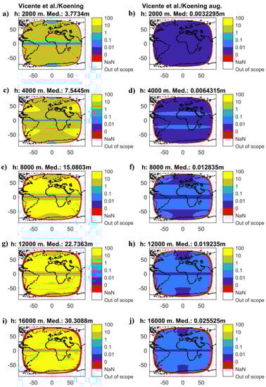 - With , , and , run the correction algorithms: Vicente et al./Koenig, Vicente et al./Koenig augmented, and the numerical geodetic coordinates method;