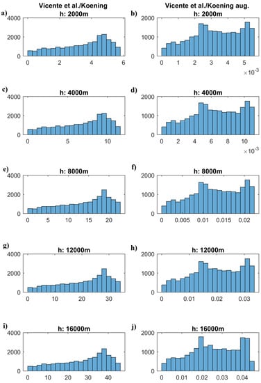Figure 8 shows histograms of the errors presented in Figure 7. In the histograms, the error ratio between Vicente et al./Koenig and its augmented version can also be spotted, which can be estimated as . Another important piece of information is that for the assumed cloud heights, the maximal error of the Vicente et al./Koenig method can be estimated at 50 m, and for the augmented version, it can be estimated at 5 cm.