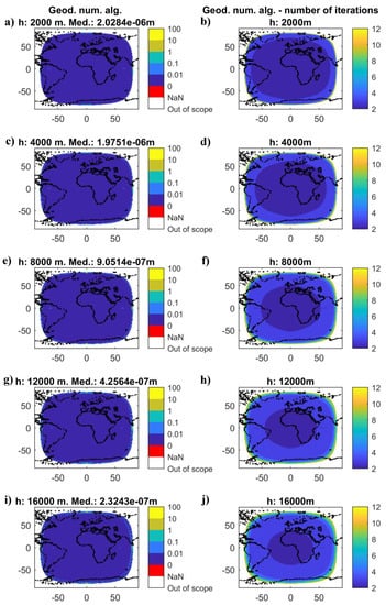 Maps with error (a,c,e,g,i) and number of iterations (b,d,f,h,j) for geodetic coordinates numerical algorithm (Geod. num. alg.) for several chosen cloud heights. Errors are given in meters for the geostationary satellite coordinate system. For each case, the median (med.) error was calculated.