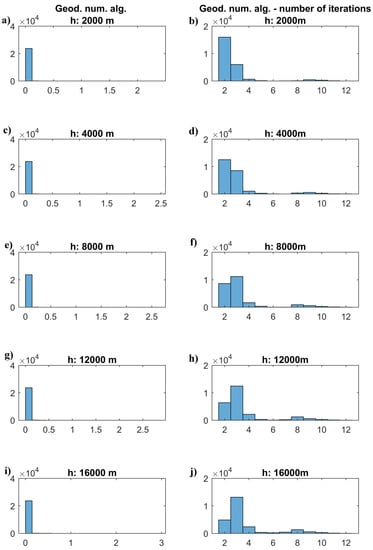 Histograms of error (a,c,e,g,i) and number of iterations (b,d,f,h,j) for geodetic coordinates algorithm (Geod. num. alg.) method for several chosen cloud heights. Error is given in meters for the geostationary satellite coordinate system.