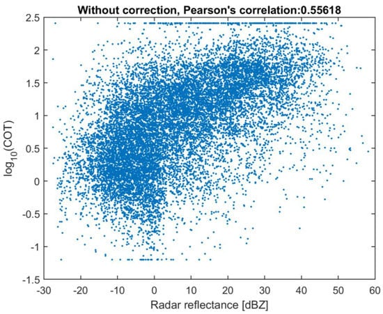 Scatterplot representing the dependence of radar reflectance and cloud optical thickness (logarithm) data for a stormy event on July 25, 2015, 13:00 UTC, without parallax effect correction (see Figure 4). The calculated Pearson’s correlation coefficient is 0.556.