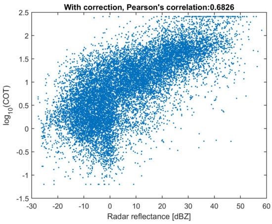 Scatterplot representing the dependence of radar reflectance and cloud optical thickness (logarithm) for a stormy event on July 25, 2015, 13:00 UTC, with parallax effect correction (see Figure 6). The calculated Pearson’s correlation coefficient is 0.683.