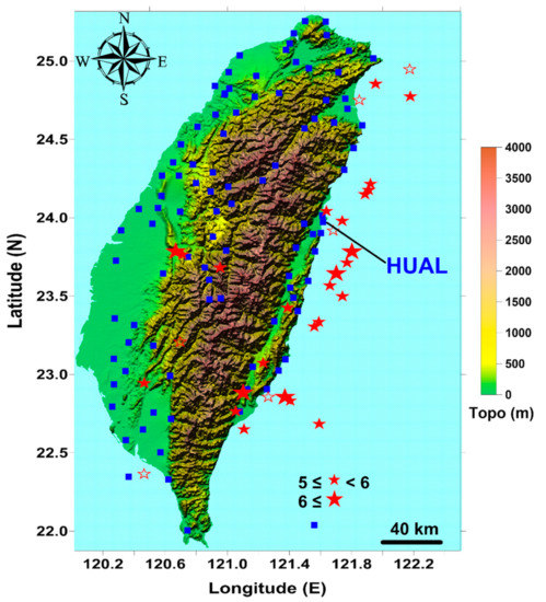 Location map of 100 global positioning system (GPS) stations (blue squares) and Central Weather Bureau (CWB)-published epicenters of the 32 earthquakes (red stars). The solid (open) stars denote earthquakes for which aligned GPS azimuths agreed (disagreed) with the P axes. Also labeled is the HUAL (Hualien) station, which was illustrated as an example for the Hilbert–Huang transform (HHT) analysis.