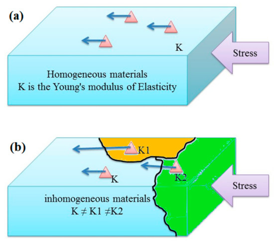 Diagrams of displacements resulting from stress accumulation in homogeneous and inhomogeneous materials. When the same stress accumulates in homogeneous materials in (a), the quantity of displacements is associated with the Young’s modulus. In reality, because the surface crust is comprised of materials with different values of Young’s modulus, characteristics of stress (as shown by blue arrows) are misunderstood when only the quantity of displacements is taken into account. On the other hand, displacements resulting from stress accumulation exhibit a similar direction regardless of the Young’s modulus of materials (as shown by blue arrows) in inhomogeneous materials in (b). The direction of stress-inducing displacements is a good substitute for the quantity of the displacements and further approaches the intrinsic qualities of stress-inducing phenomena involving inhomogeneous structures.