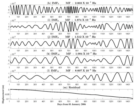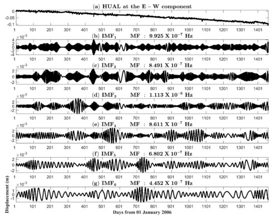 We took 5.787 × 10−7 Hz (period = 20 days) as an upper bound of the filter because high-frequency IMFs intrinsically represented the noise in this work. Figure 4a shows variations of the displacements derived from IMFs with instantaneous frequencies higher than 5.787 × 10−7 Hz (period < 20 days). Large fluctuations appeared in every summer period due to disturbances in the atmosphere and ionosphere [35]. We subtracted the high-frequency noise from displacements to generate noise-free data (Figure 4b). The long-term effects (including long-term movements, interseismic deformation, and semi-annual and annual variations in Figure 4c), estimated from the sum of the residual and points in IMFs with instantaneous frequencies lower than 7.716 × 10−8 Hz (period > 150 days), were further subtracted from the noise-free data again (shown as Figure 4d). The entire process therefore involved a critical step of using a band-pass filter with frequencies between 7.716 × 10−8 Hz and 5.787 × 10−7 Hz to retrieve the targeted GPS displacements (i.e., the residual displacements).