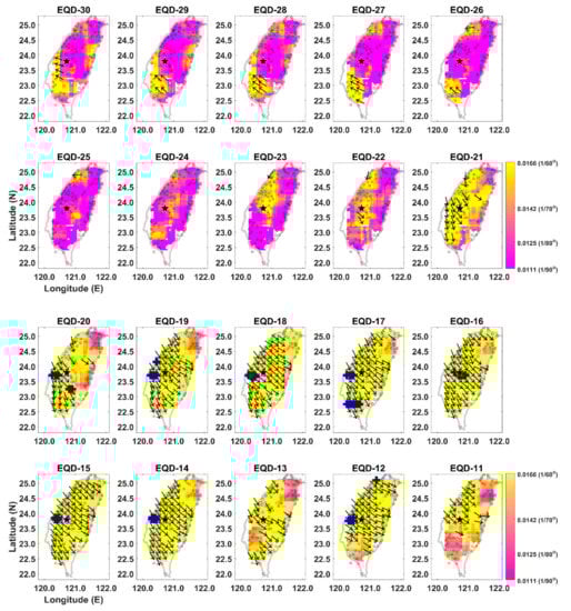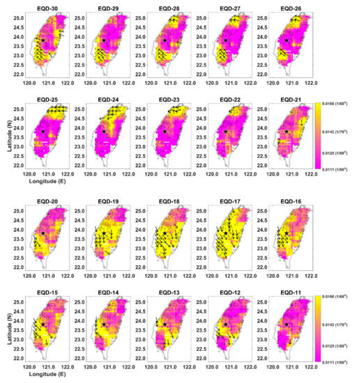 Maps of θw from 30 to 1 days before the earthquake day (EQD) of EQ28. The largest black star is the CWB-published epicenter of the EQ28. The pink and yellow colors denote areas of small (~0.011) and large (~0.02) θw’, respectively. Black arrows show the direction of surface deformation.