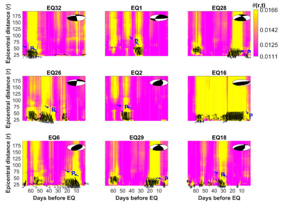 On the other hand, the P axis of EQ32 was 111°, which agreed with the 110° result obtained from the aligned GPS azimuths of θ(50, 58) (i.e., in an area with the epicentral distance ≤ 50 km and appeared about 58 days before EQ32; also see Figure 6). In contrast, the P axis of EQ1 was either 141° or 321°. The azimuths of about 310°, which was retrieved from functions via the relatively large θ(50, 34), was consistent with the P axis of EQ1. Azimuths determined from relatively large θ(r, t) agrees with the P axis of earthquakes could be observed in the 26 events of the 32 studied earthquakes. Disagreements included five M < 5.5 offshore earthquakes (i.e., EQ4, EQ8, EQ21, EQ25, and EQ30) which would have been caused by GPS stations located on land far away from the epicenters. In contrast, the other M = 5.2 land event (i.e., EQ 13) showed different characteristic changes in the GPS azimuths before the earthquake for unknown reasons (see also Reference [40]). This suggests that the analytical methods used in this study are most suitable for large and land earthquakes. The aligned azimuths from the residual displacements could be linked with the P axis, which was neither noise nor artifact, but was dominated by earthquake-related stress.