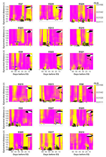 To further examine the aforementioned relationships, the 12 large earthquakes with magnitudes between 5.4 and 6.9 were qualified in this regard (shown as ID with * in Table 1). Figure 7 shows that changes in θ(r, t) along with varying r from 20 km to 200 km were associated with the 12 events on the t day, with the azimuths of residual surface displacements being most representative of the P axis of earthquakes. The θ(r, t) values were inversely proportional to r only within a relatively short range, but became relatively constant and smooth farther away. This observation suggested that surface crust near epicenters undergoes substantial displacements due to the high loading stress associated with earthquakes. Epicentral distances constrained by θ(r, t) values could be considered as the affected range of accumulating stress before earthquakes. In general, the affected epicentral distances before earthquakes with magnitudes between 6.9 and 5.4 were about 100 and 50 km, respectively (i.e., relatively high θ(r, t) values in Figure 7a,l). The affected distances roughly agreed with the radius of the earthquake preparation zones estimated in Dobrovolsky et al. [41]. Meanwhile, the likely locations of epicenters were determined by using the top 0.5% of daily θw values from the θw maps associated with EQ28 during stress accumulation periods to compare with the real (as published by CWB) one of EQ28 via the inversely proportional relationships between θ(r, t) and r. The likely locations of epicenters associated with EQ28 determined from high θw values were continuously found on days between EQD-21 and EQD-12 except on EQD-13 (Figure 5). On days of EQD-20, EQD-19, EQD-17 and EQD-12, the likely locations of epicenters were shown at two possible locations, but on other days, only a single spot (120.35°N, 23.75°E) appeared. The distance difference between the CWB-published and the likely locations of epicenters of EQ28 on the EQD-12 was about 38 km.