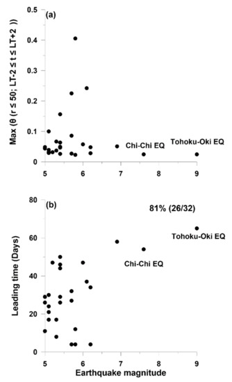 Relationships between the maximum of θ(r, t), leading time, and earthquake magnitude. Relationships between the maximum of θ(r, t) and earthquake magnitude are shown in (a). In contrast, relationships between the leading time and earthquake magnitude are shown in (b). The black circles denote the 26 earthquakes detected during the study period. Note that the maximum of θ(r, t) and the leading time associated with the Tohoku-Oki and Chi-Chi earthquakes were computed using different r values (i.e., r ≠ 50 km) because the Tohoku-Oki earthquake occurred far away from the land and due to the relatively-low density GPS array surrounding the Chi-Chi earthquake in 1999.