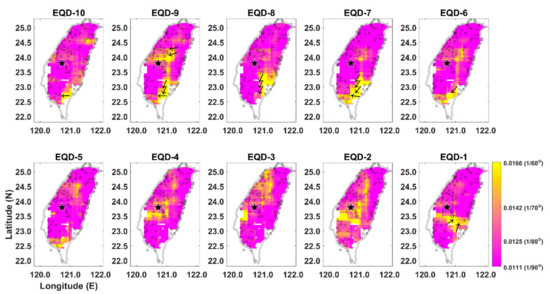 Before EQD-22, the small θw values suggest that surface crust did not experience perceptible stress associated with EQ28. After that period, southeastward movements (~145°) were obviously observed in the subsurface crust and large θw (~= 0.031; also see Figure 5) values appeared between EQD-21 and EQD-12. The direction of the southeastward movements was approximately orthogonal to the strike of the fault (228° in Table 1). The persistent stress accumulation gradually approached the threshold of rock rupture, leading affected areas to drop to small θw, which was initially observed on the southeastern side of Taiwan. The small θw values gradually expanded to all directions between EQD-10 and EQD-1, eventually encompassing the entirety Taiwan. We also found that an area (120.8°N, 23.5°E) in central Taiwan displayed relatively large θw between EQD-8 and EQD-1. Orientations of GPS azimuths in the area with relatively large θw of about 110° were consistent with the azimuth of the P axis (100°) retrieved using the method proposed in Robinson and McGinty [27]. The existence of this spot was caused by slight displacements and/or cracks [36,37,38,39] that would have developed before the main rupture of EQ28.