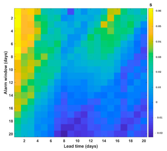 Area skill scores for predictions with different lead times and alarm windows based on observations. We performed a forecasting experiment and predicted earthquakes with depths of less than 100 km and magnitude ≥ 5.0 during the studied period in and around Taiwan.