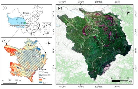 (a) Location of the Zoige Plateau in China; (b) a digital elevation model (DEM) of the study area; and (c) the natural color composition (RGB = red, green, blue) of the Landsat-OLI image of the study area in 2016.