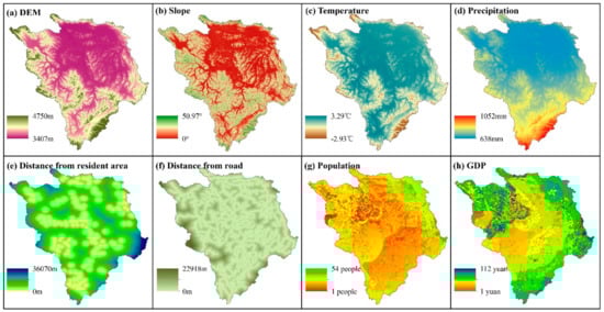 Impact factors (a) elevation; (b) slope; (c) annual average temperature in 2016; (d) annual precipitation in 2016; (e) distance from resident areas; (f) distance from road in 2016; (g) population in 2015; (h) GDP in 2015.