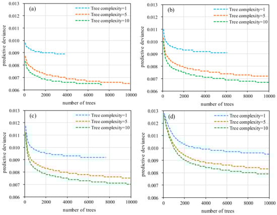 Three parameters are needed in the BRT model, including learning rate (lr), tree complexity (tc) and bag fraction. The learning rate decreases their contributions when each tree is added to the growth model. The tree complexity determines the maximum order of interaction in each tree. When the lr decreases, the ntree increases, which increases the computational cost, but a smaller lr (and larger ntree) tends to get better results []. The bag fraction specifies the proportion of training sets used for modeling in each step []. Generally, it was reasonable to set the bag fraction to 0.2 []. In order to determine the optimal combination of the lr, tc and the number of trees (ntree), models were fitted with lr = 0.05, 0.01, 0.005, 0.001 and tc = 1, 5, 10. Ten-fold cross-validation (CV) was used to verify the accuracy. Figure 4 shows the relationship between the ntree and the prediction deviation under the three tc and four lr values in the model. In general, ntree is optimal when prediction deviation reaches the minimum. The BRT model requires high stability because it is susceptible to overfitting [], therefore, we set lr = 0.01, tc = 5 and ntree = 10,000 as the optimal scheme according to the accuracy evaluation results (Table 3). In this case, the correlation is relatively high (0.88), while the difference between training data correlation and CV correlation is relatively low (0.06).