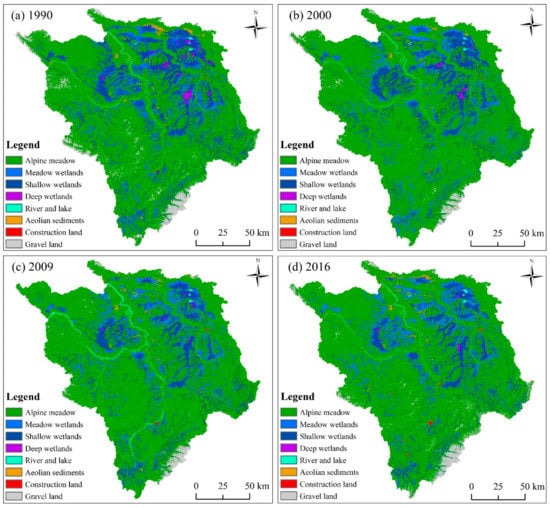 Figure 5 shows the spatial distribution map of LULC types on the Zoige Plateau for the four stages from 1990 to 2016. Alpine grassland, shallow marshes and meadow wetlands are the dominant LULC types on the Zoige Plateau, accounting for 71.77%, 12.36% and 9.48% of the total area, respectively.