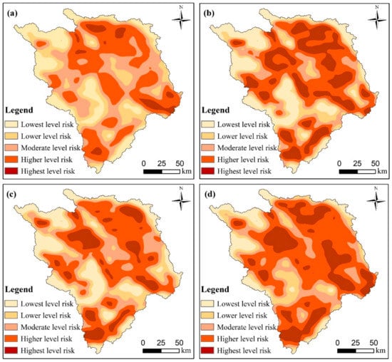 Maps of the ecological risk level in (a) 1990, (b) 2000, (c) 2009 and (d) 2016.