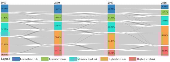 Figure 7 shows the dynamic changes and transfer direction of various types of ecological risk on the Zoige Plateau. From 1990 to 2000, the lower-level risk, moderate-level risk and high-level risk regions in the study area underwent notable changes. In particular, the proportion of lower-level risk areas decreased from 17.49% to 13.08% and primarily transformed into low- and moderate-level risk areas. The proportion of moderate-level risk areas decreased from 28.67% to 17.07% and these areas primarily transformed into higher-level risk areas. The proportion of highest-level risk areas increased from 4.14% to 21.51%, exhibiting the largest change in area among the risk levels, through the transformation of primarily higher- and moderate-level risk areas. From 2000 to 2009, the moderate- and highest-level risk areas changed to a relatively remarkable extent, and in particular, the highest-level risk area changed the most. The proportion of moderate-level risk areas increased from 17.07 to 21.31% through the transformation of higher- and lower-level risks. The proportion of the highest-level risk areas decreased from 21.51 to 11.92% and primarily transformed into higher-level risk areas. From 2009 to 2016, all types levels of ecological risk showed notable changes, and the lowest-, higher- and highest-level risk areas changed the most. The proportion of the lowest-level risk areas decreased from 18.72% in 2009 to 8.9% in 2016 and transformed primarily into lower-level risk areas. The proportion of the higher-level risk area increased from 33.29 to 40.60% through transformation of mainly moderate-level risk areas. The proportion of the highest-level risk area increased from 11.92 to 20.70% through the transformation of mainly higher-level risk areas.