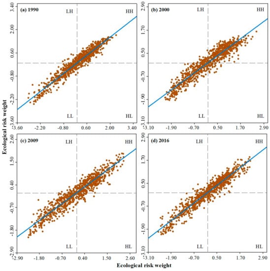 Moran scatter plots of the ecological risk in the study area (Low-high: LH, high-high: HH, low-low: LL, high-low: HL.). Under a given significance level, when Moran’s I > 0, there is positive spatial autocorrelation, indicating a clustered state of spatial ecological phenomena; when Moran’s I < 0, there is negative spatial autocorrelation, indicating a discrete state of spatial ecological phenomena. When Moran’s I = 0, there is no spatial autocorrelation, indicating a random distribution of spatial ecological phenomena [].