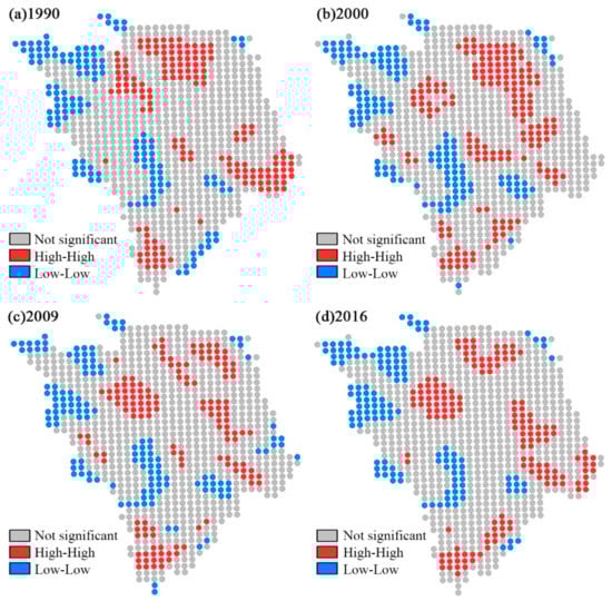 Using the spatial distribution data on ecological risk from the Zoige Plateau from 1990 to 2016, Moran’s I scatter plots (Figure 8) were obtained. The global Moran’s I values of ecological risk for the Zoige Plateau were high, reaching 0.7803, 0.7402, 0.7410 and 0.7693 in 1990, 2000, 2009 and 2016, respectively. These results indicate that the ecological risk of the study area shows a clustering effect in space and a strong positive correlation. That is, the ecological risks in the regions around areas of relatively high ecological risk are also relatively high, and the ecological risks in the regions around areas of relatively low ecological risk are also relatively low.
