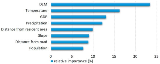 In this study, the ERI values of the four stages from 1990 to 2016 were used as dependent variables, the elevation, slope, annual average temperature, annual precipitation, distance from residential areas, distance from road, population and GDP were viewed as independent variables. The eight driving factors are shown in Figure 3. The elevation, slope, distance from residential areas are static variables, the annual average temperature, annual precipitation, population and GDP are dynamic variables.
