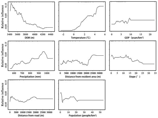 Figure 11 shows the variation curves for the relative influences of various factors, displaying the changes in factor values and their influences on the ERI. The relative effects of elevation indicate that when the elevation is less than 3740 m, the influence on the ERI is positive. In particular, the influence on the ERI increases with increasing elevation when the elevation is between 3400 and 3460 m, and the influence on the ERI decreases with increasing elevation when the elevation is between 3460 and 3740 m. When the elevation is greater than 3740 m, the influence on the ERI is negative and gradually decreases with increasing elevation. When the temperature is less than 1.7 °C, the influence on the ERI is negative, and this impact decreases with increasing temperature; when the temperature is higher than 1.7 °C, the influence on the ERI is positive, and it increases with increasing temperature. When the GDP is less than 8.5 yuan/km2, the influence of the GDP on the ERI is negative, and in particular, the relative effect is high when the GDP is less than 2.5 yuan/km2. When the GDP is greater than 8.5 yuan/km2, the influence on the ERI displays a positive correlation. When the precipitation is less than 800 mm, the influence on the ERI shows a negative correlation, and the higher the precipitation, the weaker the influence. When precipitation exceeds 800 mm, the influence on the ERI displays a positive correlation. The influence of the distance from residential areas on the ERI first has a negative correlation and then a positive correlation, with a threshold value of 21.9 km. As the slope increases, the value of the ERI first increases and then decreases, with a threshold value of 16°. The influence of the distance from the road on the ERI is primarily within a range of approximately 20 km, and as the distance increases, the influence on the ERI successively shows negative, positive, negative and positive correlations. The relative effect of the population is somewhat irregular, over a range of 4 to 20 people/km2, and the influence on the ERI tends to increase gradually with the increasing population.
