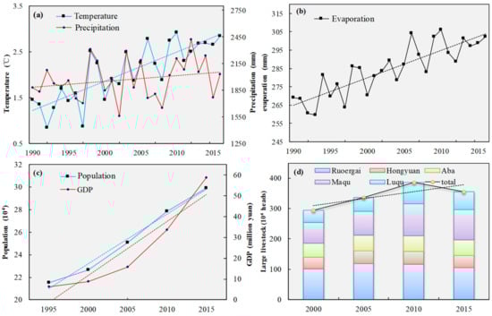In terms of climate, temperature and precipitation are the primary factors influencing the ERI. The higher the temperature and the lower the precipitation in a region, the relatively higher the ecological risk. According to Figure 12a,b, from 1990 to 2016, the temperature in the study area showed a notable increase, the precipitation basically remained the same, the evaporation increased significantly. With its location east of the Qinghai–Tibet Plateau, the Zoige Plateau is a typical fragile alpine ecological zone and is very sensitive to climate change []. In the context of global climate change, the variation in the warming and drying of the Zoige Plateau has caused a decrease in the surface runoff, the drying of marshes, shrinkage of lakes and the desertification of grasslands in this area, resulting in the deterioration of its ecological stability [,,].