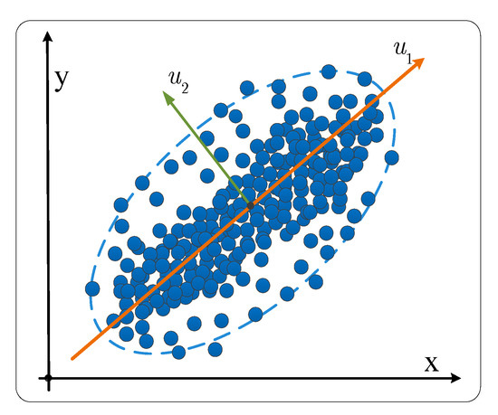 PCA is generally used in determining the maximum variance direction of a given data set [37,38], which maps a data set into another one in a new coordinate system, where the first coordinate represents the largest variance of the data set. As depicted in Figure 3, based on this property, the largest variance is represented by the first principal component in the PCA method (the largest variance indicates the maximum dispersion and represents the largest amount of information contained), and the main energy direction of the data set is then determined. It is also interesting to note that targets (military aircraft and ships) in SAR systems always present a unique direction with the largest variance because of their elliptical geometric shapes. Based on this reason, in this work, PCA is utilized to estimate the direction of the main energy of linear RCM, which is one of the main innovations.
