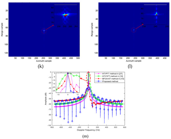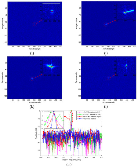To demonstrate the anti-noise performance of the proposed algorithm, a moving manoeuvring target with a low SNR of –8 dB is generated. In Figure 6a, the result after range compression is provided. The range walk corrections obtained by the HT-FrFT method in [16] and the HT-PFT method in [27] are demonstrated in Figure 6b,c. It can be seen that the RCM is not fully corrected in this case. Figure 6d shows the RCM correction results with the BFCA-KT method in [10], and it can be seen that the RCM has been compensated. After applying the PD operation, the range curvature has been removed, as demonstrated in Figure 6e. Figure 6f shows the RCM correction results with the PCA method. After correcting the RCM, the motion trajectory has been slightly tilted since the PCA is unstable under the low SNR. The CPF and CICPF results are depicted in Figure 6g,h, respectively. Following motion compensation, the well-refocused result for the manoeuvring target is obtained in Figure 6i. The focusing results obtained by the HT-FrFT method in [16], HT-PFT method in [27], BFCA-KT method in [10] and the proposed method are depicted in Figure 6j–l. It is worth noting that the proposed method has better refocusing results than the HT-FrFT method in [16] and the HT-PFT method in [27], and the BFCA-KT approach has the same integration quality as the proposed method. However, compared with the BFCA-KT approach, as discussed earlier, the proposed method has a great advantage in computational cost. Figure 6m presents the comparison results of the azimuth profiles, it can be seen that the proposed method has better refocusing results, which also validate the effectiveness of the proposed method.