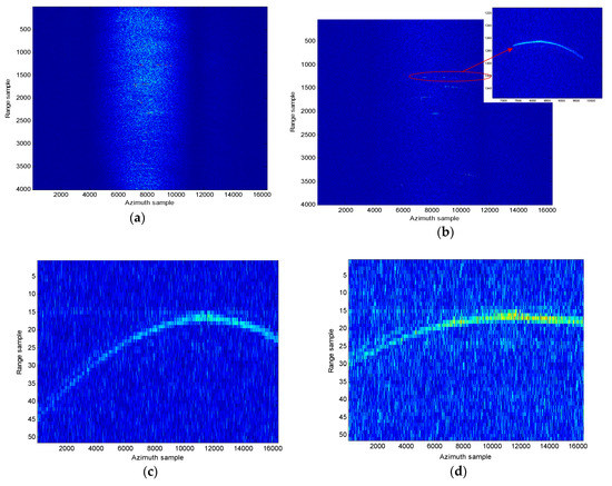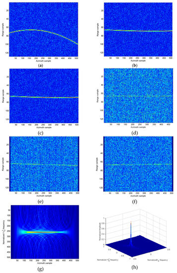 where denotes the azimuth Doppler bandwidth. It is obvious from Equation (22) that the energy of the ground manoeuvring target has been refocused into a sharp peak point. Figure 4 shows the steps of the proposed approach.