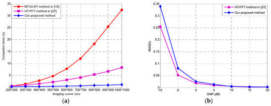 Performance comparison results with existing methods. (a) Comparison of three methods along the imaging scene size. (b) Root mean square errors (RMSEs) of the estimated parameter versus SNR.