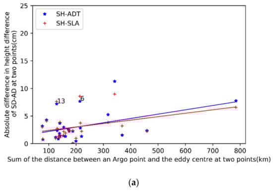 To obtain better SD-AD results, we used more factors to analyze the results. At , there is a distance between the Argo and the satellite. At there is still a distance between the Argo and the satellite. Figure 7 shows the relationships between the SD-AD as a function of the distance difference between these two distances. Regardless of the SH or SHA, the relationship of the SD-AD had a similar trend; moreover, no matter for the SH and SHA, the ADT data performed better than the SLA data when the distance difference was smaller. However, the results after linear regression were different in terms of the slope, the SHA slope larger than the SH one, thus, the SHA datasets had a clearer trend. In Figure 7b, with the distance different between the distance of the Argo and the satellite in and being larger than 13 km, the results became larger than 3 cm for the SHA case. However, there are some special set of data that the SD-AD performed poorly even when the distance difference between and was not very large, such as for No. 13. As shown in Figure 4b, the distance difference between and were similar; at this time, the directions of the Argo positions relative to the altimetry positions became another contributing factor. At and , the angle difference between Argo position and satellite positions is close to 180 degrees. However, the sea level variability in the small range always occurred in the same direction. At and , compared with the position of the Argo point, in which the satellite position in the different direction, the sea level variability was different. Therefore, making the distance difference between and similar and the direction between the Argo points and altimetry data points similar are an important condition when using the SD to validate the altimetry data.
