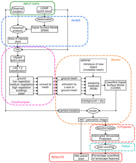 The output of the QLA360 method is the set of equirectangular 360° panoramic images, including ground, low, medium, and high vegetation separately, buildings, water, and sky visible from the perspective of the observers of known locations. This gives a wide variety of result presentation possibilities. The equirectangular images can be directly used in Virtual Reality devices, which can be useful for subjective visual impact assessment by the observers. Moreover, the equirectangular renders can be easily converted to stereographic (little planet) projections, which can help to understand the direction and spatial distribution of landscape features from the human perspective. In order to quantify the amount of visible landscape features, 360° panoramic images have been transformed to the Interrupted Sinusoidal Projection, which is a type of Equal-Area projection [40]. For the transformation, the G.Projector software developed by the National Aeronautics and Space Administration (NASA) was used. In order to reduce the distortion to a minimum, the 10° Gores Interruption was applied. Next, the pixels of colors representing each class were counted in every image. As the different classes are represented with different colors (RGB values), the amount of landscape features can be quantified as the percentage of pixels representing different colors (classes). In this study, in order to automate the task, the pixels were counted using Python and the PIL library (Appendix B), but it can be done in most graphic editor software such as Photoshop or Gimp. Percentage quantities of landscape features can be joined to the observer location vector points as the attributes. The results can be presented as charts with a percentage distribution of landscape features or thematic maps showing the classes separately.