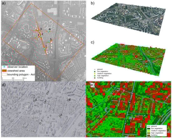 The QLA360 methodology was tested in the example of the City of Poznań, Poland. In the first stage, on the basis of the LiDAR point cloud, a DSM was developed. Then, the viewshed analysis was carried out for the six example observer locations with the set height of 1.7 m above the ground (Figure 2a). On the basis of the viewshed analysis results, the minimum bounding geometry tool was used to create an AoI polygon. It has an area of 1.71 km2 and was used to limit the range of further analysis. The point cloud with assigned RGB color values (Figure 2b) and class values according to the LAS 1.2 standard (Figure 2c) was clipped to the AoI extent. Next, the points were extracted separately by their class values, converted to meshes in CloudCompare software, and imported to Blender software (Figure 2d). In Blender, the material was assigned for each mesh class (Figure 2e). Next, the CDSM created in Blender and observer locations were used for rendering the 360° panoramic images.
