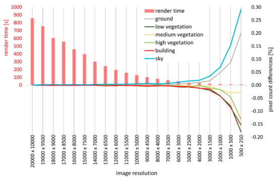 Renders were made as equirectangular images with the resolution of 10,000 × 5000 pixels for all analyzed observer locations. This resolution was selected on the basis of the analysis performed on a set of images rendered with different resolutions for a single location (Figure 3). The difference in the number of pixels representing particular classes was less than 0.005%, and the render time was 129 s. All renders were made on the PC with the following parameters: Intel(R) Core(TM) i7-8700K CPU with 48 GB RAM and NVIDIA GeForce GTX 1080Ti GPU.